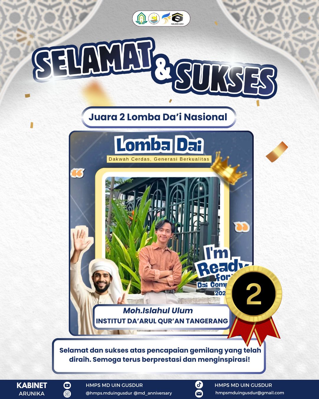 Prestasi membanggakan kembali ditorehkan oleh mahasiswa Fakultas Ushuluddin. Islahul Ulum, mahasiswa Semester V, berhasil meraih sejumlah prestasi bergengsi dalam berbagai ajang lomba tingkat nasional yang diselenggarakan oleh beberapa perguruan tinggi ternama di Indonesia. Capaian ini menjadi bukti nyata kualitas akademik, intelektual, dan dakwah mahasiswa Ushuluddin di kancah nasional. Prestasi pertama diraih Islahul Ulum sebagai Juara 2 Lomba Da’i Nasional yang diselenggarakan oleh HMPS Manajemen Dakwah UIN KH. Abdurrahman Wahid (UIN Gusdur) Pekalongan pada 15 November 2025. Kompetisi ini mengusung tema “Dakwah Cerdas, Generasi Berkualitas” dan diikuti oleh peserta dari berbagai perguruan tinggi Islam di Indonesia. Dalam ajang tersebut, Islahul Ulum dinilai mampu menyampaikan pesan dakwah secara argumentatif, komunikatif, dan relevan dengan tantangan generasi muda masa kini. Prestasi berikutnya diraih pada 15 Desember 2025, ketika Islahul Ulum berhasil meraih Juara 1 Lomba Pidato dalam ajang “SIF 2025 (Syeikh Nurjati Islamic Festival)” yang diselenggarakan oleh Lembaga Dakwah Mahasiswa UIN Siber Syeikh Nurjati Cirebon. Dengan tema “Islam is My Way of Life: Islam Menuju Hati yang Tenang”, Islahul Ulum tampil meyakinkan melalui pidato yang kuat secara substansi keislaman, retorika, serta kedalaman pesan spiritual. Tidak berhenti di situ, Islahul Ulum kembali menorehkan prestasi gemilang dengan meraih Juara 1 Lomba Gen-Z in Dakwah Konten Kreator Tingkat Nasional dalam ajang “Qur’an Festival (Q-Fest)” yang diselenggarakan oleh BEM STIQ Multazam Kuningan, Jawa Barat, pada 9–10 Januari 2026. Kegiatan ini mengusung tema “Menumbuhkan Mindset Qur’ani dalam Restorasi Peradaban Islam di Era Modernisasi”. Melalui konten dakwah kreatif berbasis media digital, Islahul Ulum dinilai berhasil menyampaikan nilai-nilai Al-Qur’an secara inovatif, kontekstual, dan mudah diterima oleh generasi muda. Dekan Fakultas Ushuluddin, Dr. Mohamad Mualim, Lc., MA, menyampaikan apresiasi dan rasa bangganya atas capaian tersebut. Menurutnya, prestasi Islahul Ulum mencerminkan keberhasilan proses akademik dan pembinaan karakter mahasiswa di lingkungan fakultas. “Prestasi yang diraih Islahul Ulum merupakan bukti bahwa mahasiswa Ushuluddin tidak hanya unggul dalam penguasaan keilmuan, tetapi juga mampu mengaktualisasikan nilai-nilai dakwah Islam secara kreatif, moderat, dan relevan dengan perkembangan zaman. Kami berharap capaian ini menjadi inspirasi bagi mahasiswa lainnya untuk terus berprestasi dan berkontribusi bagi umat dan bangsa,” ujar Dr. Mohamad Mualim. Ia juga menegaskan bahwa fakultas akan terus mendukung dan memfasilitasi pengembangan potensi mahasiswa, baik dalam bidang akademik, dakwah, maupun kreativitas digital, sebagai bagian dari komitmen mencetak generasi intelektual muslim yang berdaya saing nasional dan berakhlak Qur’ani.