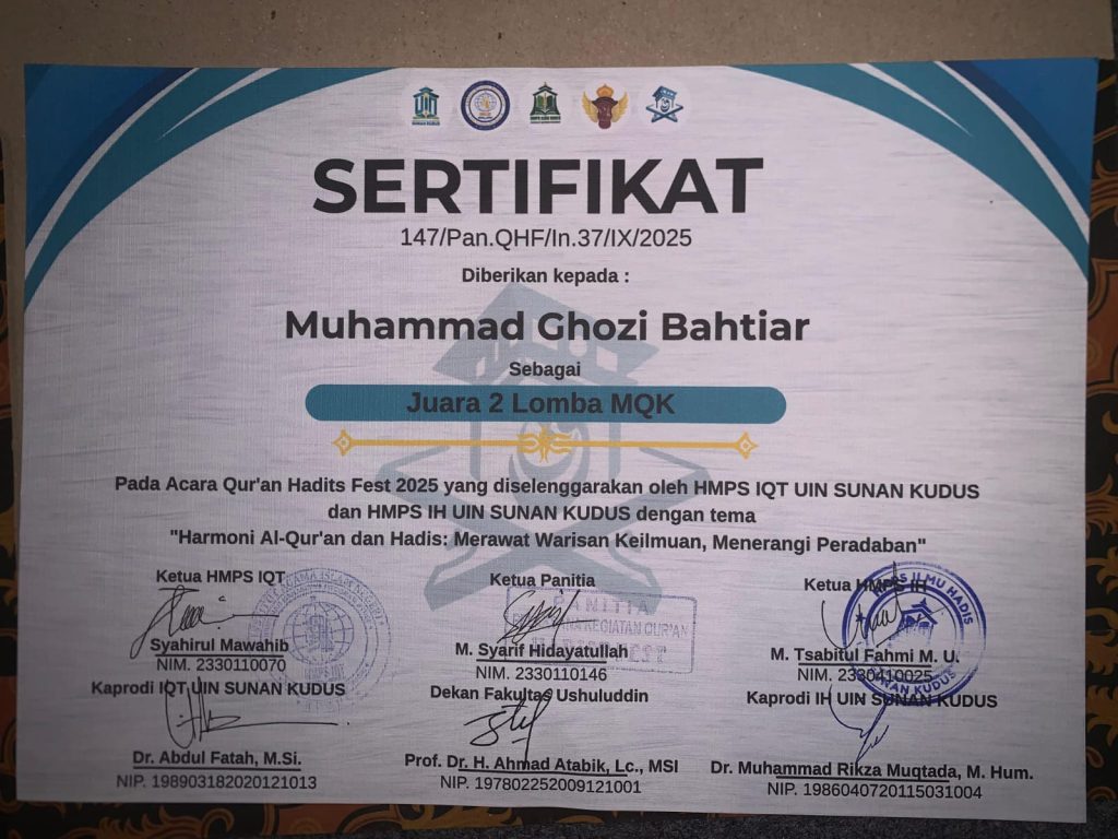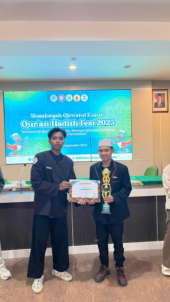 Tangerang – Prestasi membanggakan kembali diraih mahasiswa Fakultas Ushuluddin Institut Daarul Qur’an (IDAQU) Jakarta. Muhammad Ghozi Bahtiar berhasil meraih Juara 2 dalam ajang Musabaqoh Qiraat al-Kutub pada acara Qur’an Hadis Fest 2025 yang diselenggarakan oleh Himpunan Mahasiswa Program Studi (HMPS) Ilmu Al-Qur’an dan Tafsir (IQT) serta Ilmu Hadis (IH) UIN Sunan Kudus pada 23–24 September 2025.
